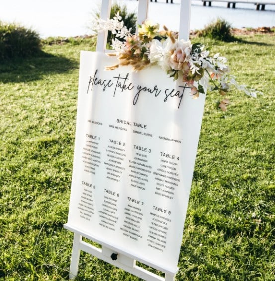 Accueillez vos invités avec cette charmante et élégante enseigne de mariage. C’est le moyen idéal d’ajouter une touche personnelle à votre journée spéciale. Cette enseigne en mousse est légère et durable, ce qui la rend facile à exposer sur votre lieu de mariage. Personnalisable avec vos noms, dates et une variété de polices et de couleurs.